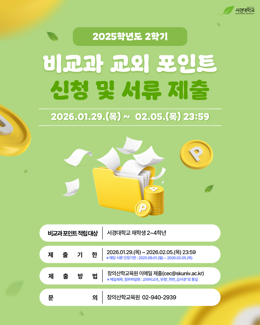 ㅇ 비교과 포인트 적립 대상 : 재학생 2~4학년 ㅇ 제출기한 : 2026. 1. 29.(목) ~ 2026. 2. 5.(목) 23:59 – 해당 서류 인정 기한 : 2025.9.1.~2026.2.5.